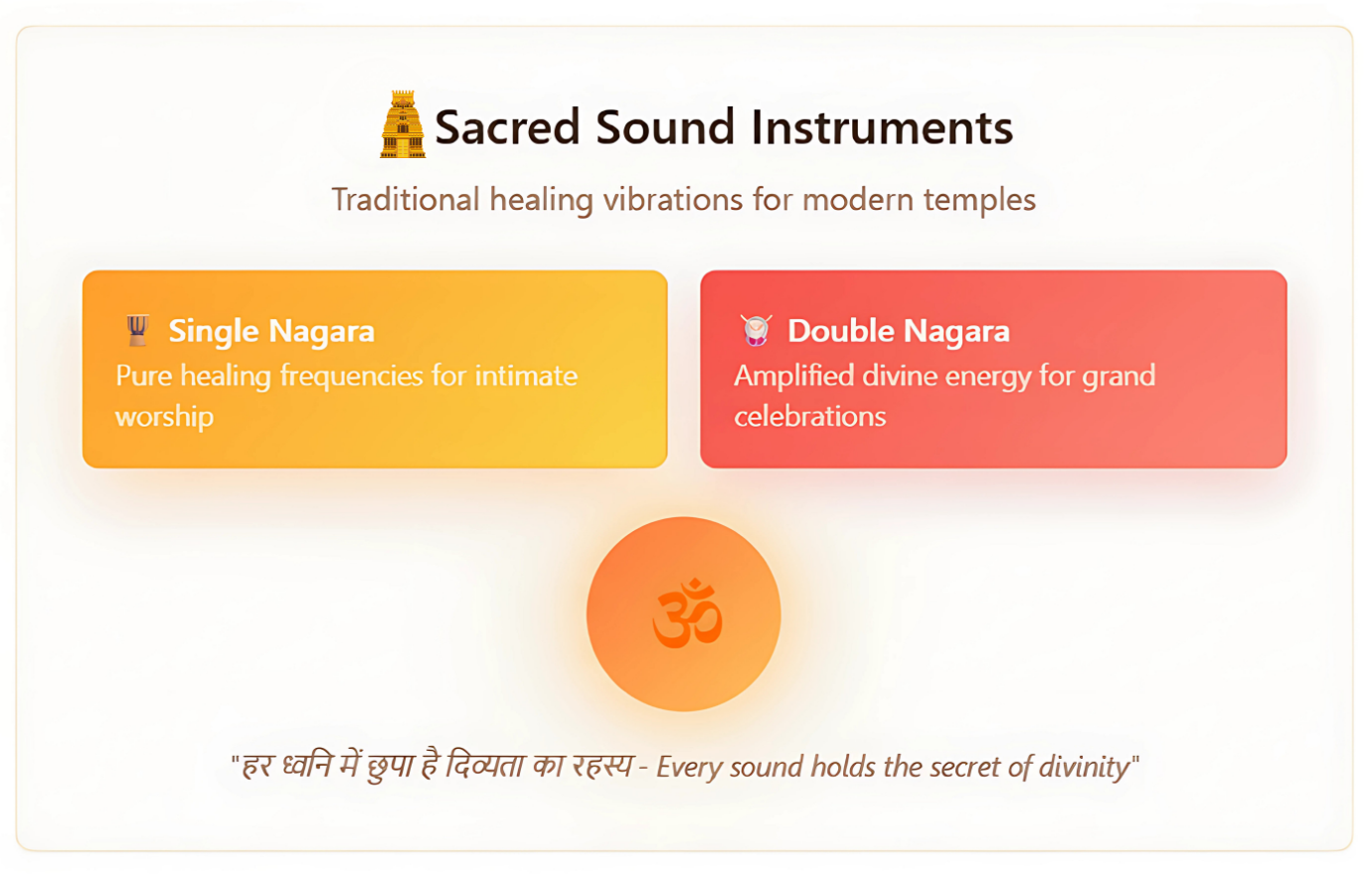 While the world turns to artificial speakers, we preserve the ancient healing power of authentic Nagara, Jhalar, and drums. Each sound wave calms your mind, soothes your heart, and connects your soul to the divine - scientifically proven, spiritually transformative.